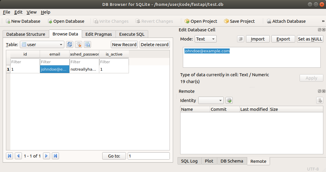 If you want to explore the SQLite database (file) directly, independently of FastAPI, to debug its contents, add tables, columns, records, modify data, etc. you can use DB Browser for SQLite.
